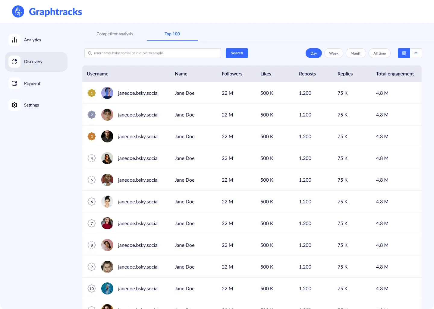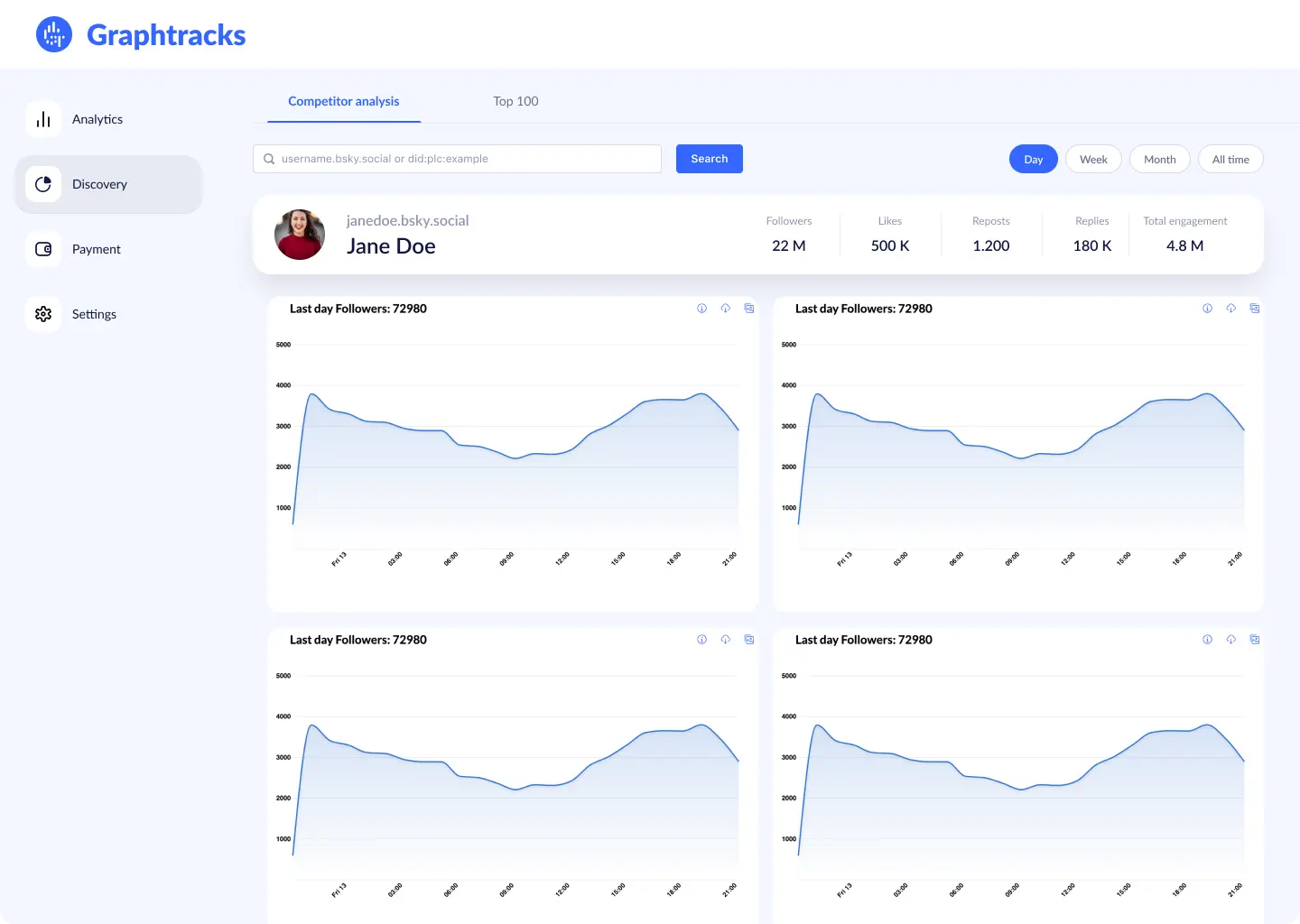 If your day starts and ends with BlueSky, Graphtracks will be your best friend! Join now and discover powerful analytics that will help you make informed decisions. With our platform, you can better understand your online presence, spot important trends, and improve your content strategy.