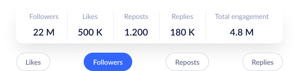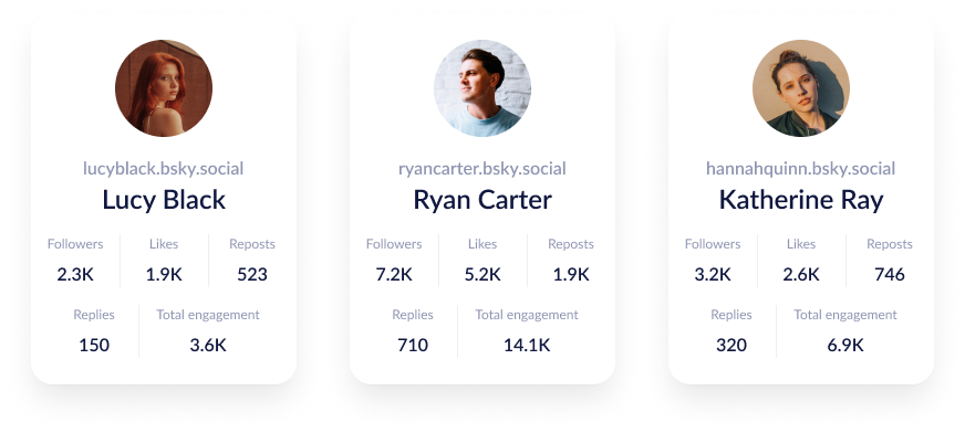 Gain a holistic view of an account's performance with our new dashboard. This feature summarizes key engagement statistics, enabling quick assessment of the impact and reach of any account within the Bluesky network.