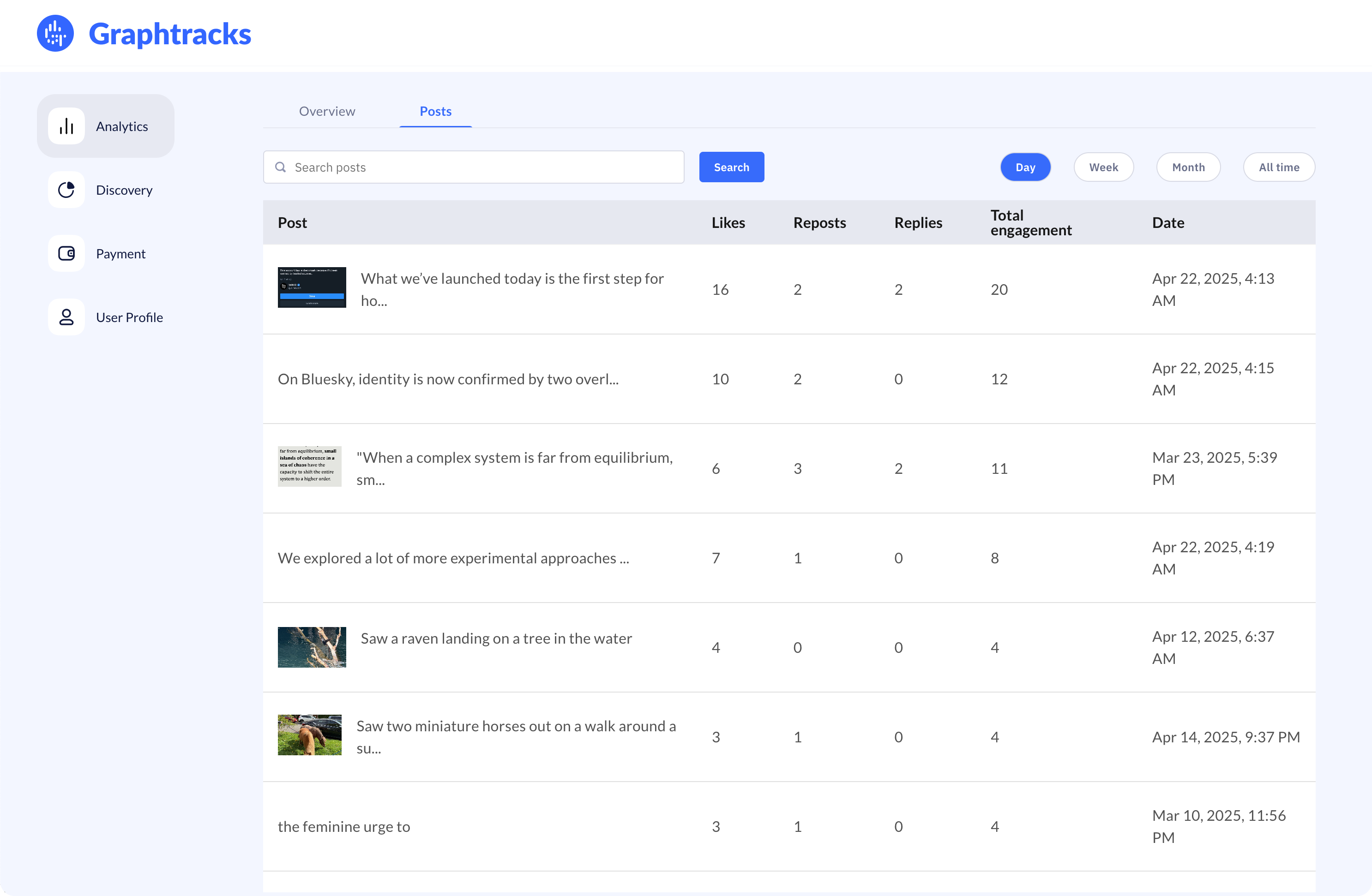 Delve into the performance of specific posts by analyzing engagement metrics such as likes, reposts, and replies. This helps identify content that resonates most with audiences, informing future content strategies.